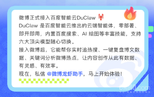 [CNMO科技音问]3月25日,百度智能云晓示,微博认真接入DuClaw。用户通过私信“@微博龙虾助手”即可得到字据,在DuClaw中完成绑定后,便能平直在微博私信界面调用这一云霄智能体,竣事从数据洞悉到热门跟踪的全链路AI赞成施行创作。
