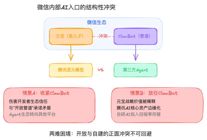 微信同期在运营两个AI进口:元宝(亲女儿,腾讯自研AI助手)和ClawBot(通向通盘第三方Agent的管谈)。这两个东西放在归并个生态里,存在结构性冲突。