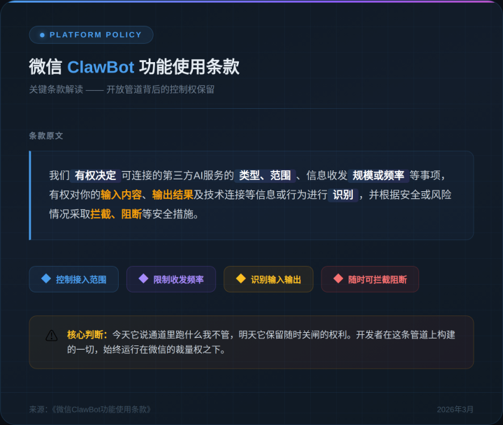 微信ClawBot的灵通是有条件的灵通,是随时不错收回的灵通。这种”有限灵通”短期能贬责风险,但耐久天花板也被这个条件所适度。