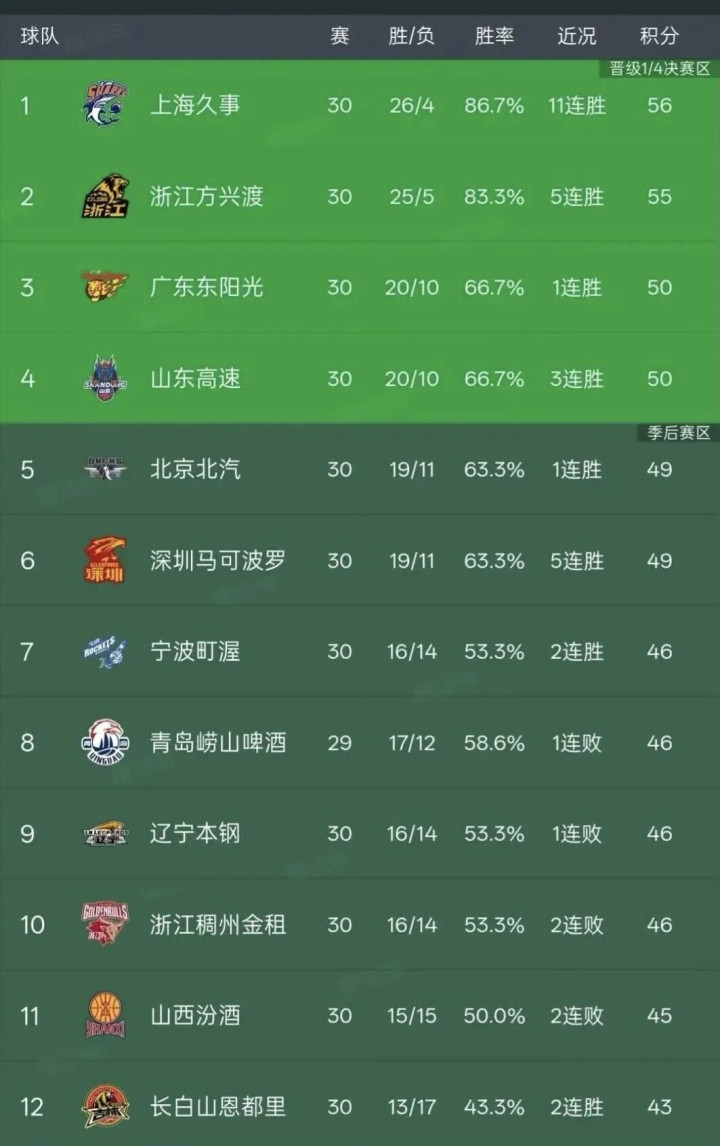 不外在第30轮比赛中,由于上海队治服了山西队、广东队打败了四川队,是以上海队超过了广厦队来到积分榜第一,广东队超过了深圳队重新回到了积分榜第三。山东高速队在上一期积分榜上排名第五,不外在第30轮比赛中,由于收货了一场顺利,因此,他们的排名上涨了一位,咫尺暂列积分榜第四。北京队相通上涨了一位,在第30轮积分榜上排名第五。深圳队连降三位,在最新一期的积分榜上排名第六,不外他们的战绩同北京队一样,都是19胜11负。