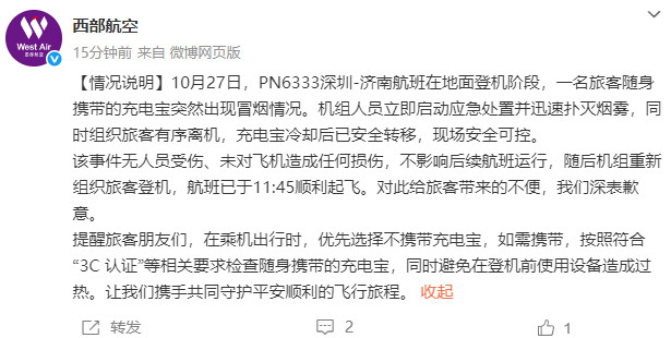 2025年10月27日,西部航空PN6333深圳-济南航班在大地登机阶段,别称搭客随身佩带的充电宝瞬息出现冒烟情况。