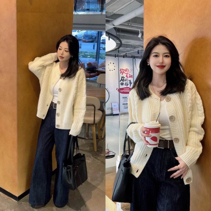 选浅黄色真挚开衫与米白色V领打底叠穿,欺骗左近色营造柔柔脉络感,且V领拉长脖颈线条。下装搭配深蓝色牛仔阔腿裤,“上紧下松”突显躯壳弧线,显瘦又缓和。可配检朴项链、追究腕表,增添细节感,让合座穿搭更出彩。
