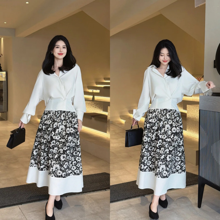 白色收下摆衬衫自带大气感,搭配口角碎花半身伞裙,经典配色检朴又耐看,“上紧下松”突显比例。选追究尖头鞋点缀,增添优雅气质。可搭配工致耳环、检朴腕表,细节处晋升追究度,好像打造出检朴又高等的出街造型。