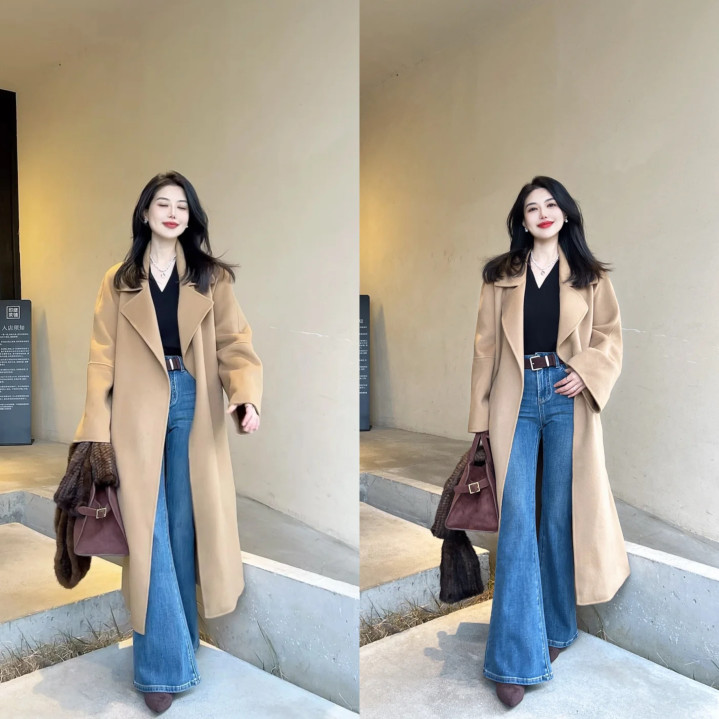 毛呢大衣亦然春季必备的御寒外衣,不错应酬多变的天气,不外春季天气相对相比缓和,是以推选吸收面料较薄的名堂,比如双面呢追究又高等,廓形较大的版型更有助于遮肉显瘦,内搭修身的玄色V领+蓝色高腰微喇裤,外松内紧,显瘦后果一绝。