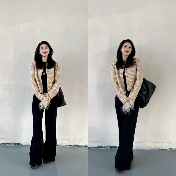 想要造型更追究高等的宝子们,小香风外衣是首选,略带点金色的小香风短外衣,内搭玄色打底无间玄色微喇裤,颜色搭配浅易大气又耐看,展现好躯壳的同期,让通盘这个词东说念主显得愈加追究。