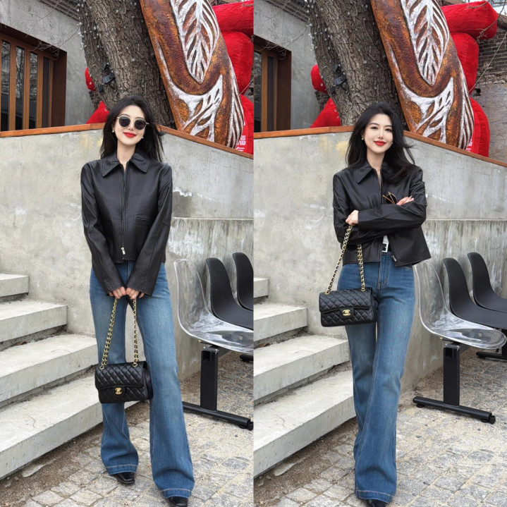 除了夙昔的短外衣,短款皮夹克亦然春季凹造型的前厉害器,玄色超短款皮夹克,内搭白色T恤打底,下半身吸收蓝色高腰微喇牛仔裤,好像打造完满的三七分躯壳,尤其适用于躯壳五五分的宝子们,调动躯壳比例,从打造高腰线初始。