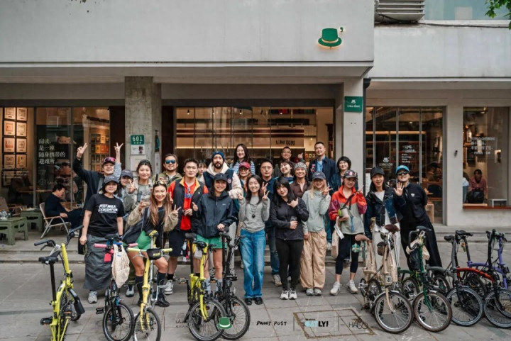 参与“世界地球日”骑行举止的东说念主们打卡合影