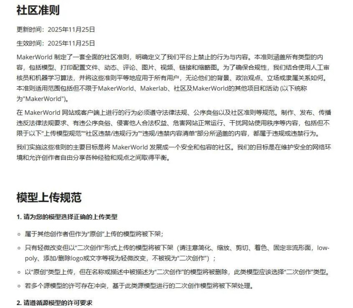 事实上,在拓竹科技的MakerWorld官网,列有《社区准则》,写明“准则涵盖总共类型的践诺,包括模子、打印确立文献、动态、驳倒、图片、视频、流通和缩略图。为了确保合规性,咱们引诱使用东说念主工审核员和机器学习算法,并将这些准则对等地应用于总共效户”。换句话说,拓竹科技并非莫得法则和模子轨范。