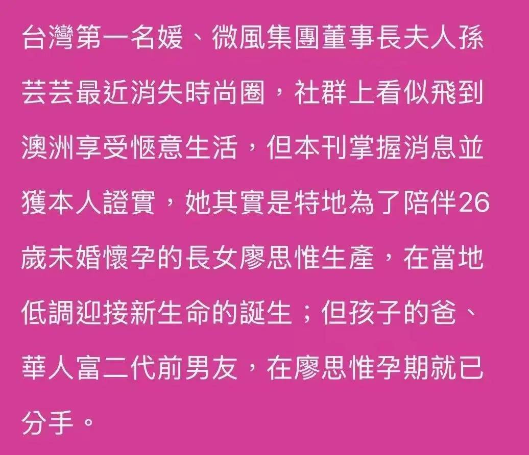 也就是说,在媒体的想路里,廖想维应该是刚坐褥完没多久,孙芸芸一东谈主赶赴温雅男儿,是因为阿谁孩子爸、被指的“华东谈主富二代”在廖想维孕期跑路。