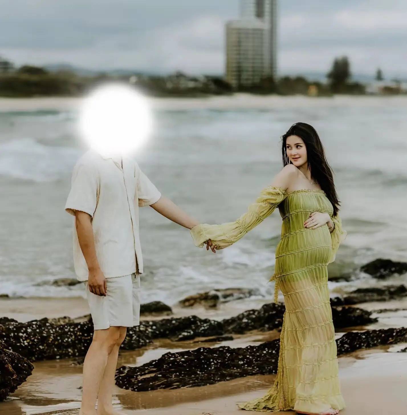 起首他晒出了廖想维的孕肚照,两个东谈主在海边拍下温馨的一幕。廖想维一稔一字肩的纱裙,看向男士的模样尽是爱意。