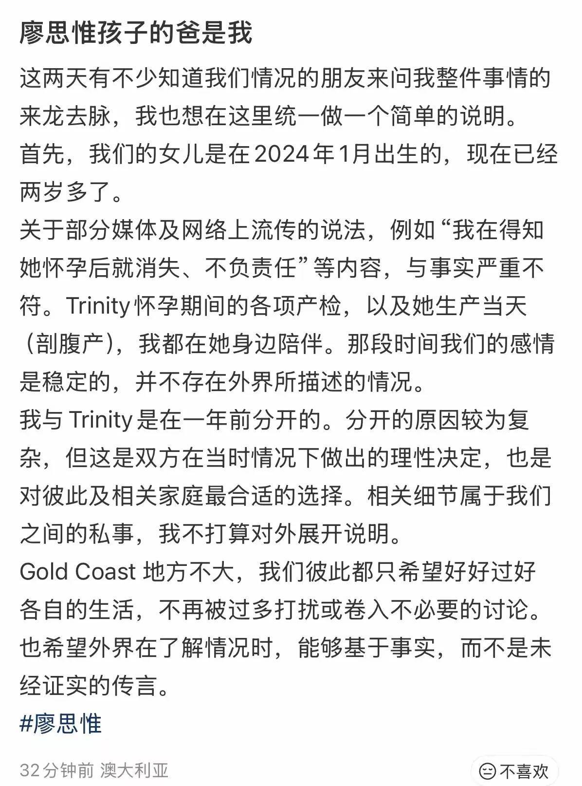 孩子爸和廖想维分开,是在一年前、也就是男儿一岁的时候。因为分开原因比拟复杂,孩子爸讲明两边皆是作念出了感性的决定。