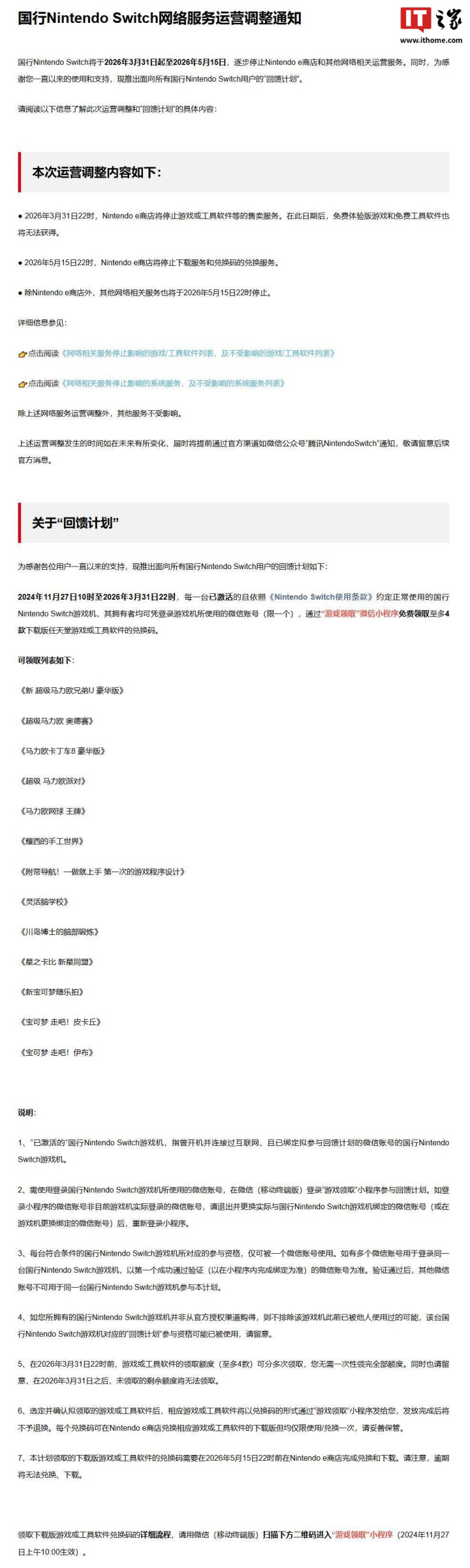 除Nintendoe商店外,其他收罗关系就业也将于2026年5月15日22时住手。